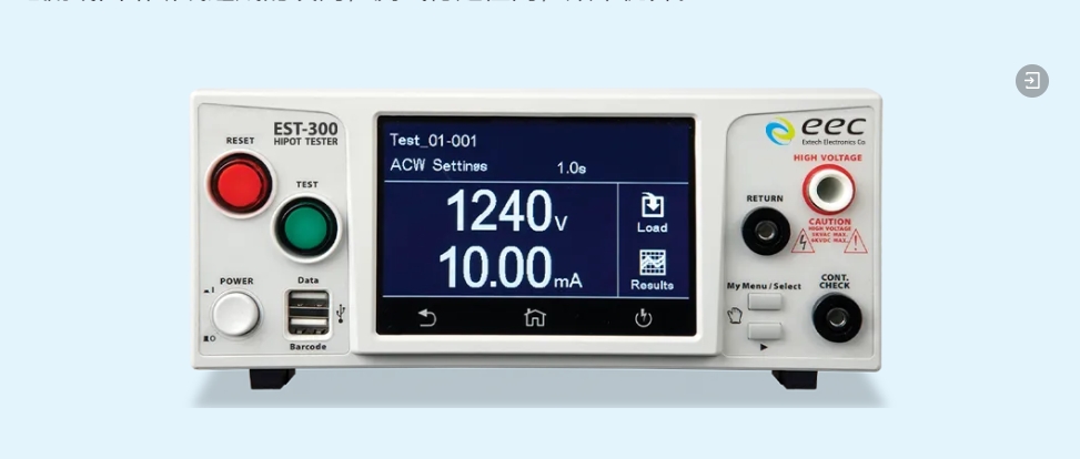 EST集成交流耐壓(ACW)、直流耐壓(DCW)、及絕緣阻抗(IR)三合一功能,搭配EEC獨創之緩升上限功能(Ramp-High)與充電下限功能(Charge-Low)技術,有效過濾異常電流或回路斷線造成的誤判,測試穩定性高,效率優異。